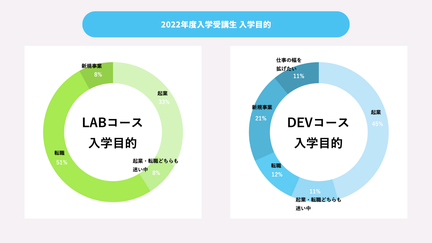 入学目的は、コースごとに大きな違いが見られました。週末集中DEVコースでは起業を目指す方が5割を占め、アイデアを自らの手で形にできる起業家を目指す方が多いことが分かります。一方フルタイム総合LABコースではエンジニアを志す方が5割を占めており、クリエイティブなITエンジニアを目指す方が多く入学されています。卒業制作を制作する過程では、エンジニア志望の方と起業志望の方がチームを組んで一つのプロダクトを制作する光景もよく見られます。