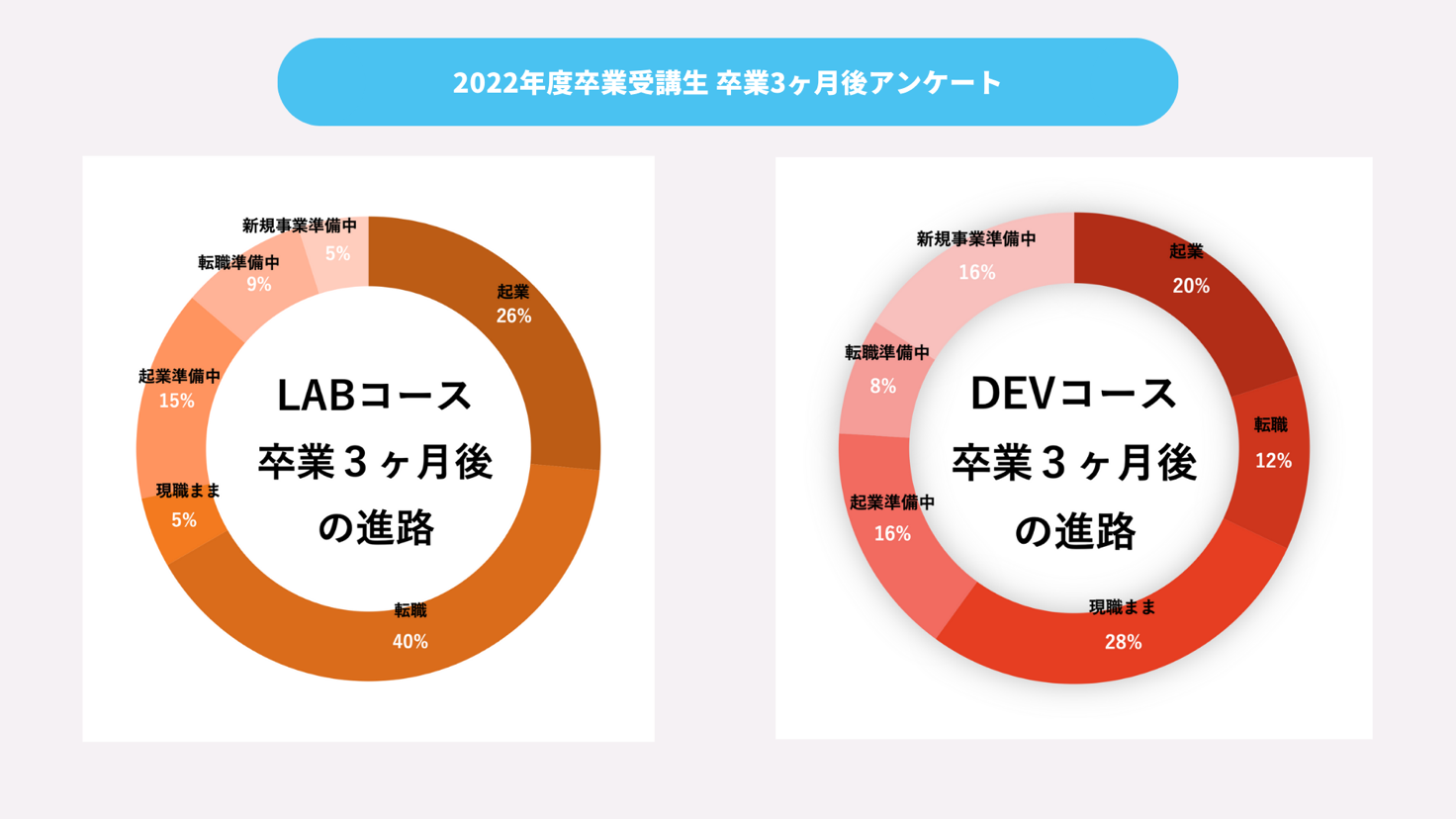 2022年4~2022年10月に卒業した卒業生に対し、卒業3か月後に振り返りアンケートを取った結果、卒業生の進路は起業や転職だけでなく、現職に学びを活かす方、新規事業に取り組む方など多岐に渡りました。