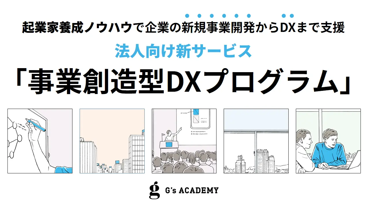 ジーズアカデミーが開校以来1,900名以上もの起業家およびエンジニアを輩出してきたノウハウを凝縮し、大企業の新規事業開発からDX(デジタルカルチャーの浸透)へとつなげる法人向け新商品として開発しました。
