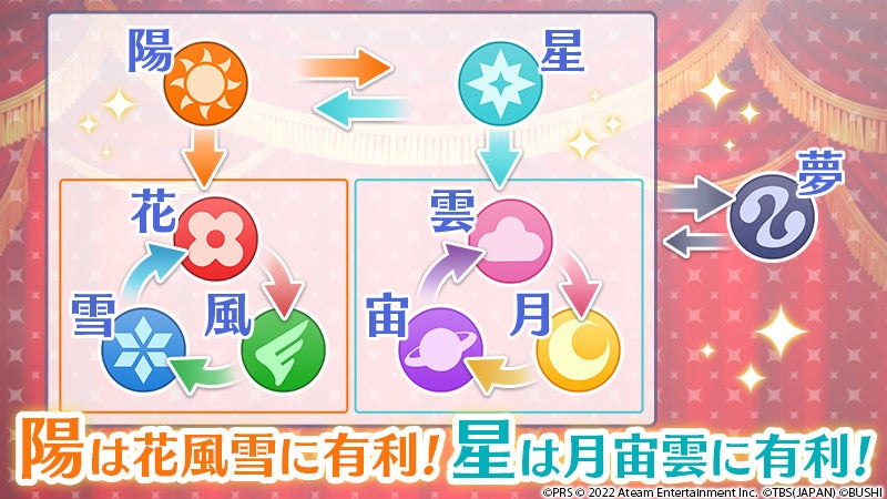 従来の属性は夢属性を除き一つの属性にのみ優位な関係となっていましたが、「陽」は花・風・雪・夢・星に、「星」は月・宙・雲・夢・陽にと、幅広く有利な属性となっており、大きなダメージを与えやすく活躍しやすい属性です。