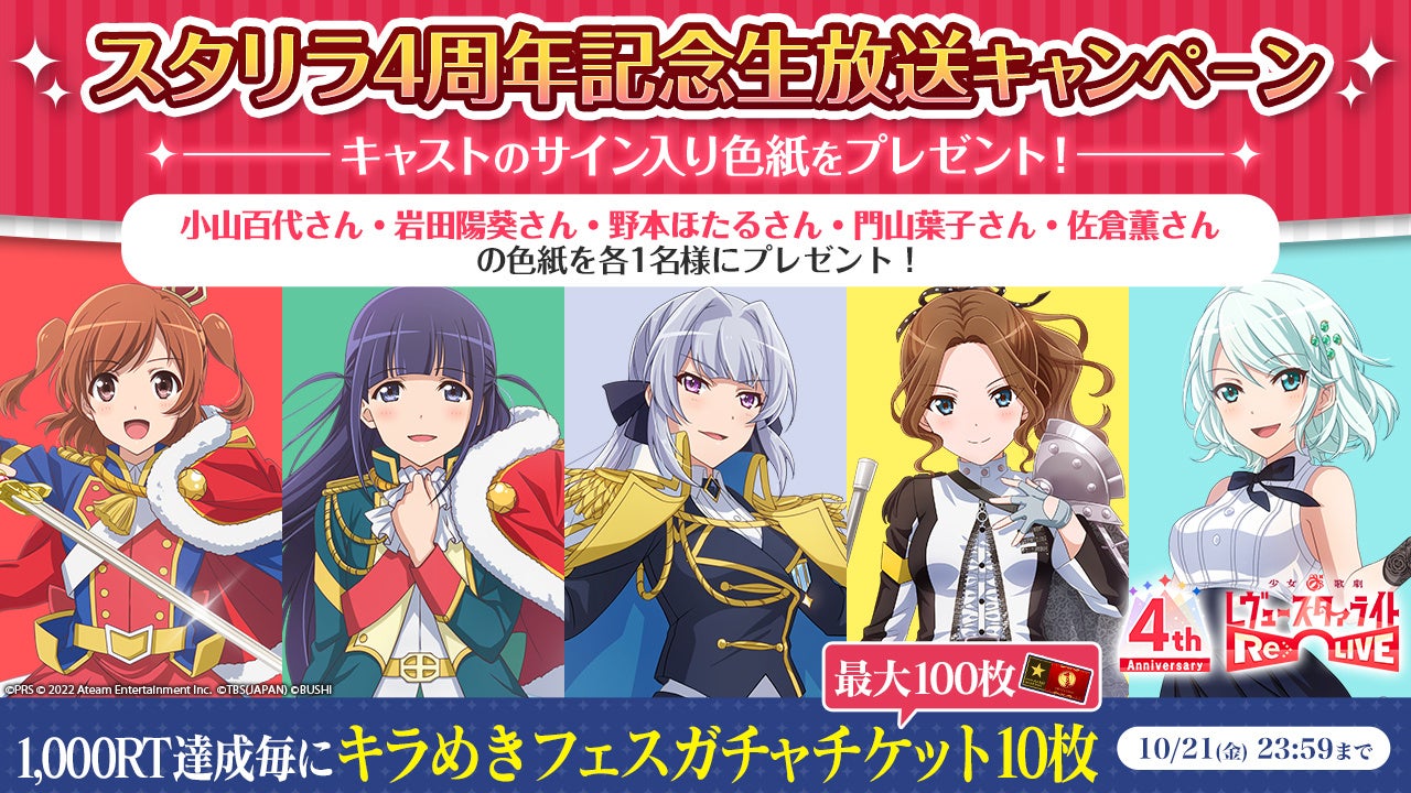 『スタリラ』公式Twitter(@starlightrelive)をフォローし、対象の投稿をリツイートすると、抽選で各1名様(合計5名様)に愛城華恋役の小山百代さん、露崎まひる役の岩田陽葵さん、雪代晶役の野本ほたるさん、穂波氷雨役の門山葉子さん、える役の佐倉薫さんのサイン入り色紙が当たります。