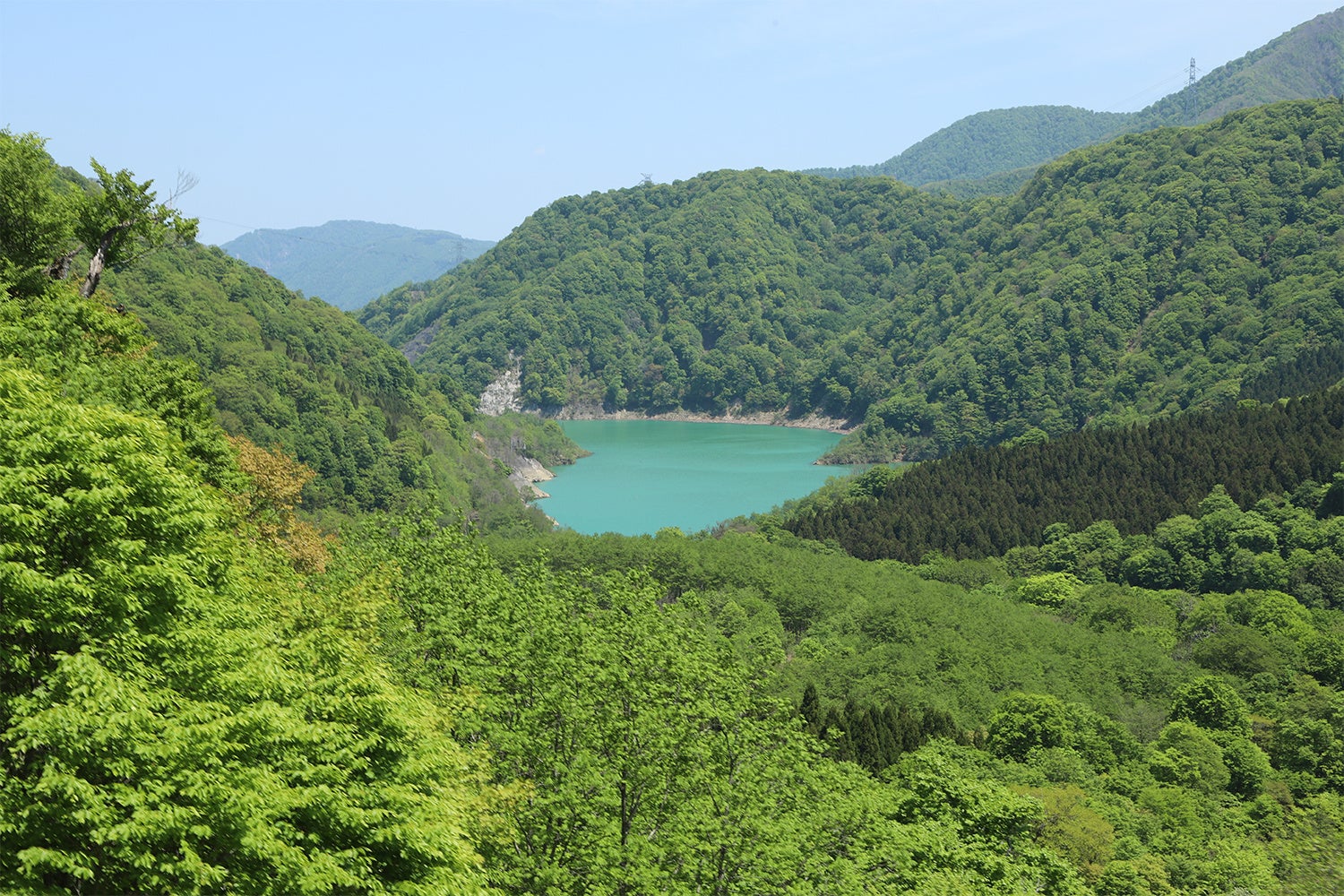 新緑の季節は、沿線に広がる「ブナ」や「ホウノキ」、「トチノキ」や「フジ」などの木々が芽吹きをはじめ、野鳥のさえずりや雪どけを感じる川のせせらぎなど、生命力あふれる美しい景色にこころが癒されます。また、道中にはエメラルドグリーンに輝く二居湖や一気に急降下していく14号柱など、魅力あふれるビューポイントがあり、五感で感じながら残雪と新緑の絶景を満喫することができます。