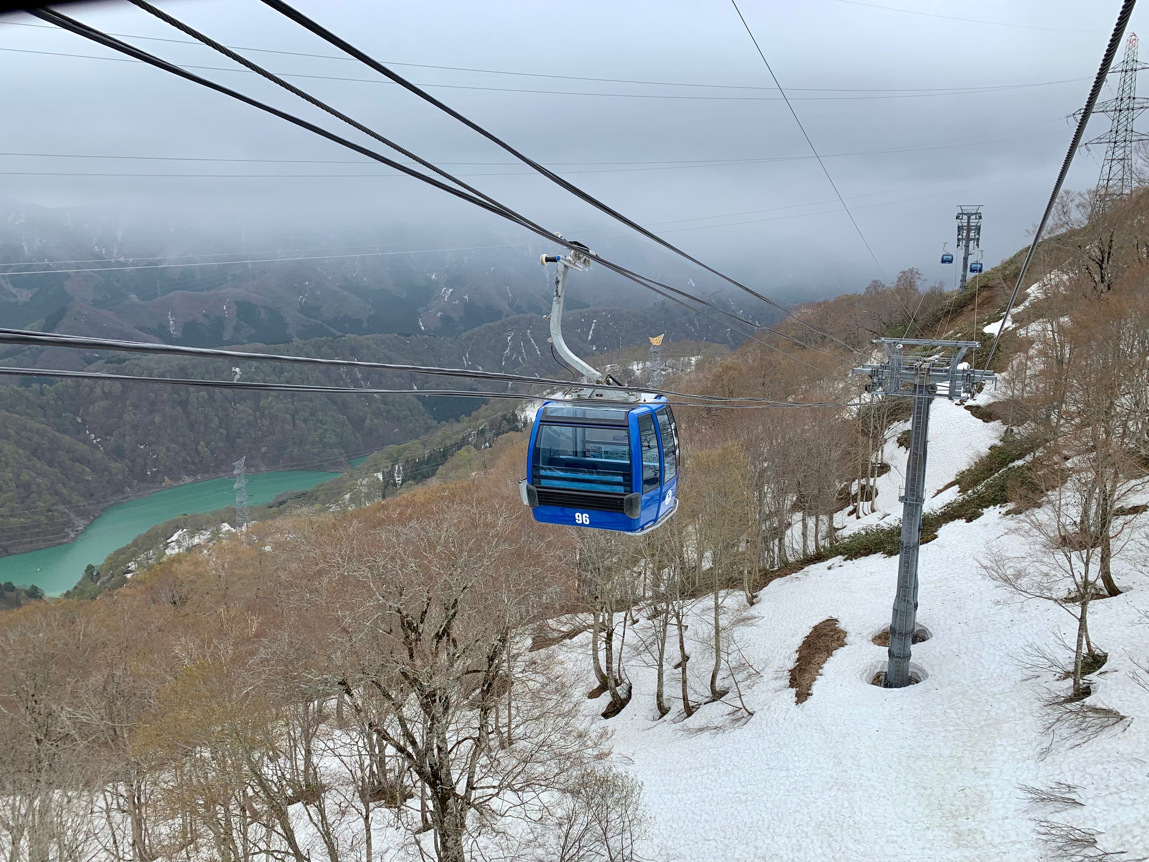 残雪と新緑の間を進む苗場ドラゴンドラ