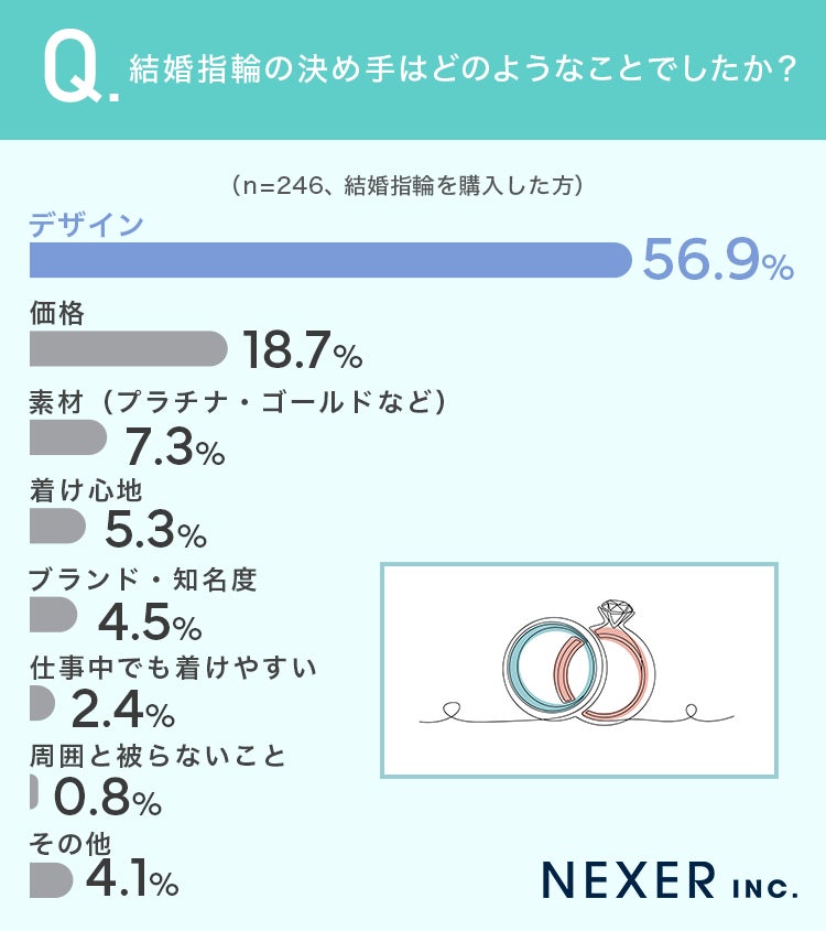 最も多かったのは「デザイン」で、56.9%と半数以上を占めています。次いで「価格」が18.7%、「素材(プラチナ・ゴールドなど)」が7.3%、「着け心地」が5.3%、「ブランド・知名度」が4.5%と続きました。
