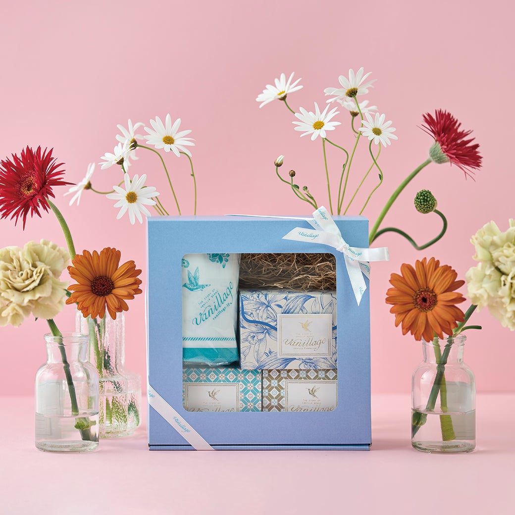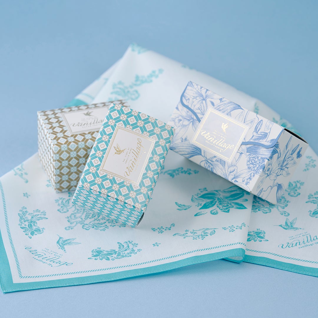 ③バニラの香りが広がるディアマンクッキー2種類とバニラフィナンシェをご堪能いただけます。※数量限定BOXです。【バニラージュ オリジナルハンカチ】ブランドカラーのブルーのハチドリとバニラの花が美しい〈バニラージュ〉オリジナルのハンカチです。