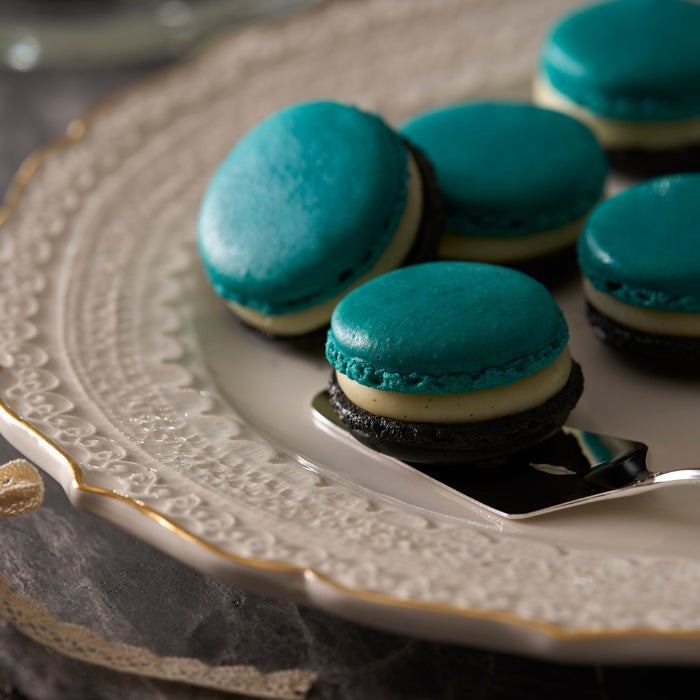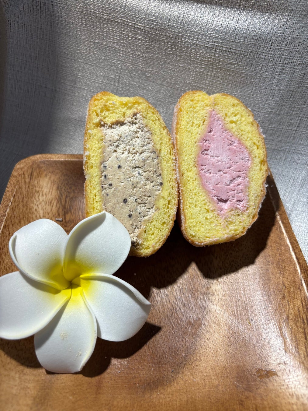 ➀マカロンの生地の外側は「クッキーとマシュマロを合わせたような食感」、内側は「最中やキャラメルのような食感」の新食感スイーツです。口に含むと生地がとろけて中に挟まったガナッシュクリームと一緒になり、より濃厚な味わいとバニラの香りが口いっぱいに広がります。
