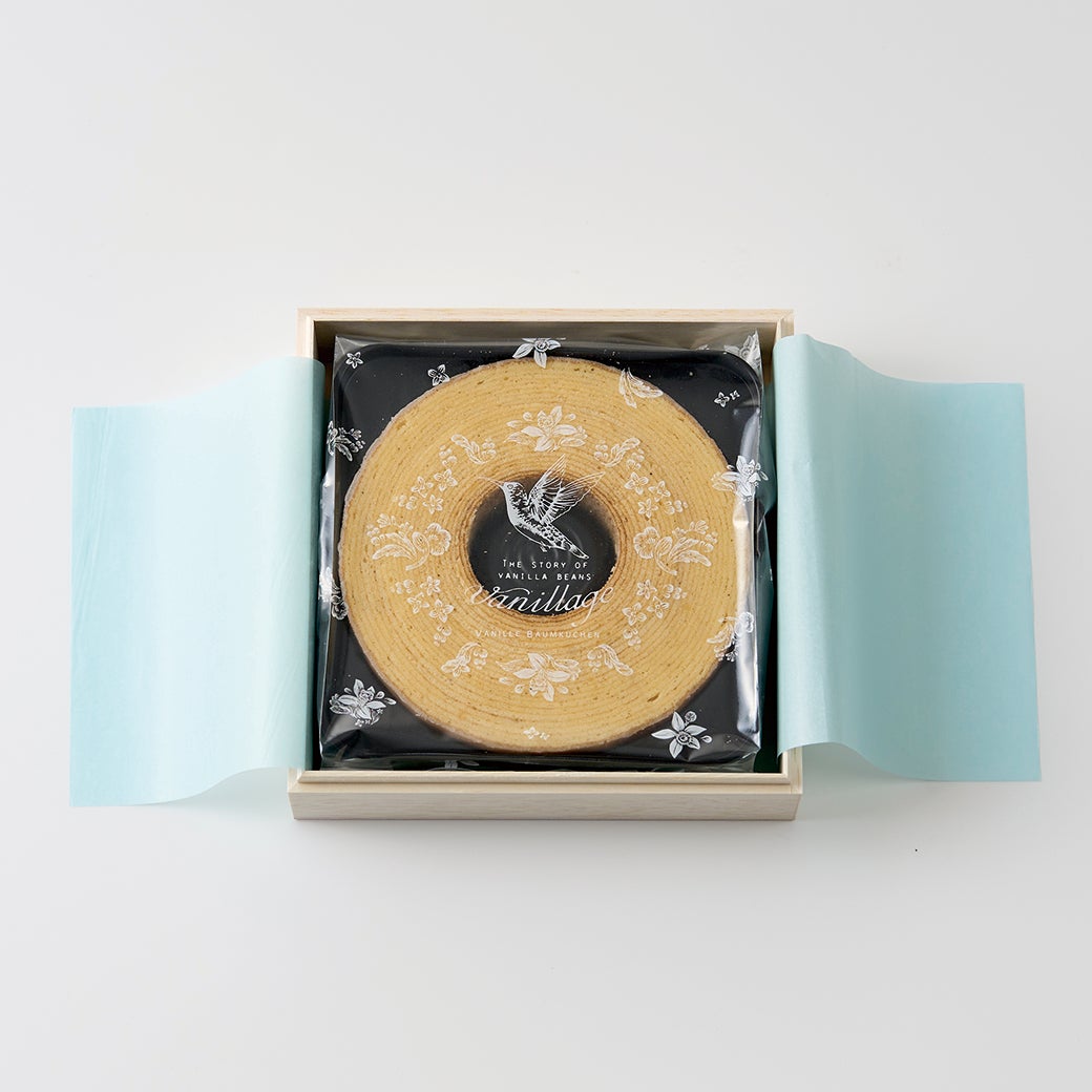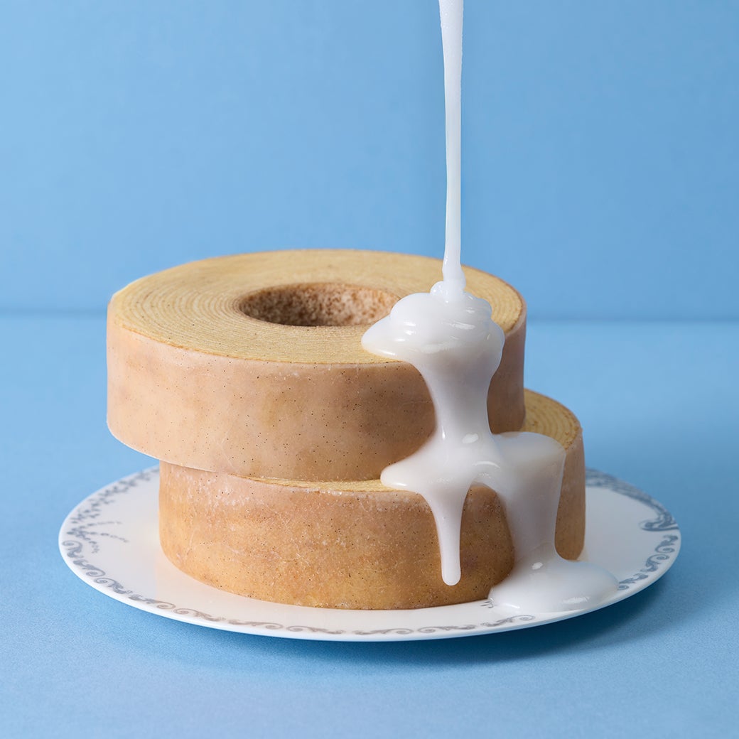 ②しっとりとした食感の上品なバニラバウムクーヘン。まわりの繊細なフォンダンにもバニラビーンズを使用しており、口に入れた瞬間しっとりなめらかな食感に優しいバニラの味が広がります。