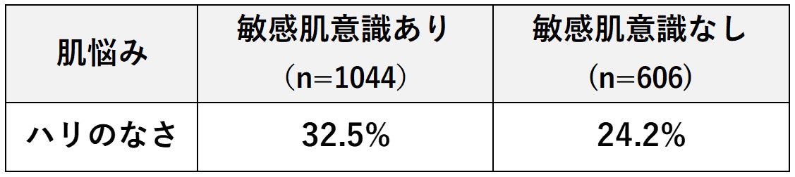 敏感肌意識を持つ女性の増加に伴い、敏感肌対応の女性化粧品市場は年々拡大しています。女性を対象に調査※3 を実施したところ、敏感肌意識のある方は、敏感肌意識のない方に比べ、「ハリのなさ」のエイジング悩みが高いことがわかりました。