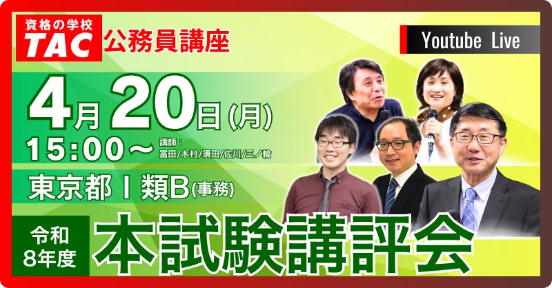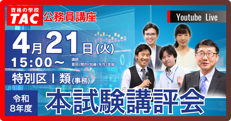 資格の学校TACは、4/19(日)に実施される2026年度公務員試験「東京都Ⅰ類B[行政/一般方式]採用試験」・「特別区(東京23区)Ⅰ類[事務]採用試験」の専門記述試験・論文試験模範解答を本試験データリサーチ登録者限定で、4/24(金)17時よりTACホームページで公開いたします。