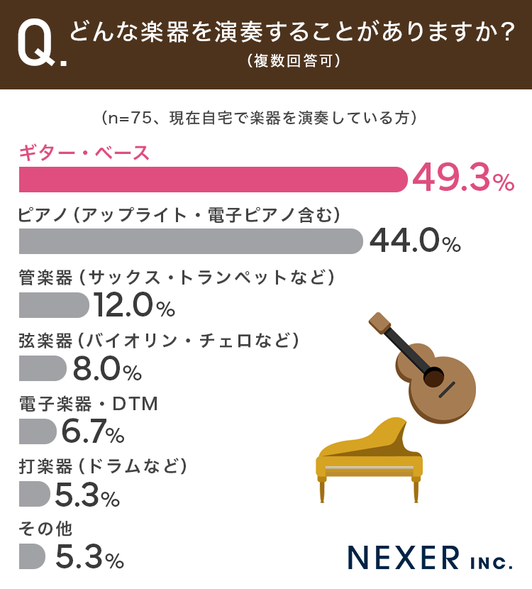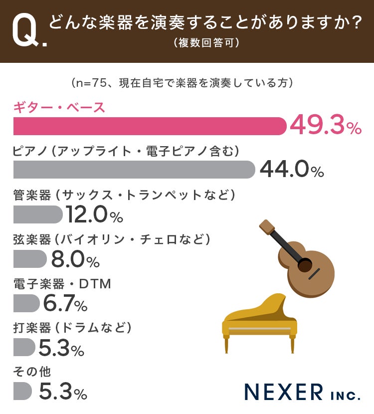 最も多かったのは「ギター・ベース」で49.3%でした。次いで「ピアノ(アップライト・電子ピアノ含む)」が44.0%、「管楽器(サックス・トランペットなど)」が12.0%と続きます。手軽に始めやすい弦楽器や、長く親しまれているピアノが上位を占める結果となりました。