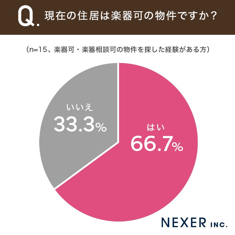 その結果「はい」と回答した方が66.7%、「いいえ」が33.3%となりました。物件探しの経験がある方のうち、3人に2人は実際に楽器可の物件へ入居できていることがわかります。