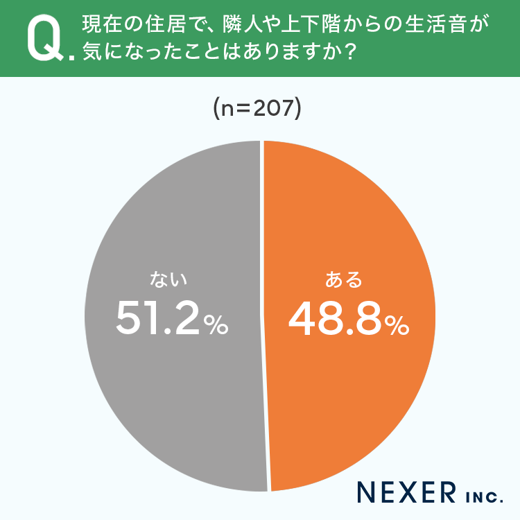 その結果「ある」と回答した方は48.8%でした。約半数の方が、近隣からの生活音に悩んだ経験があることがわかります。