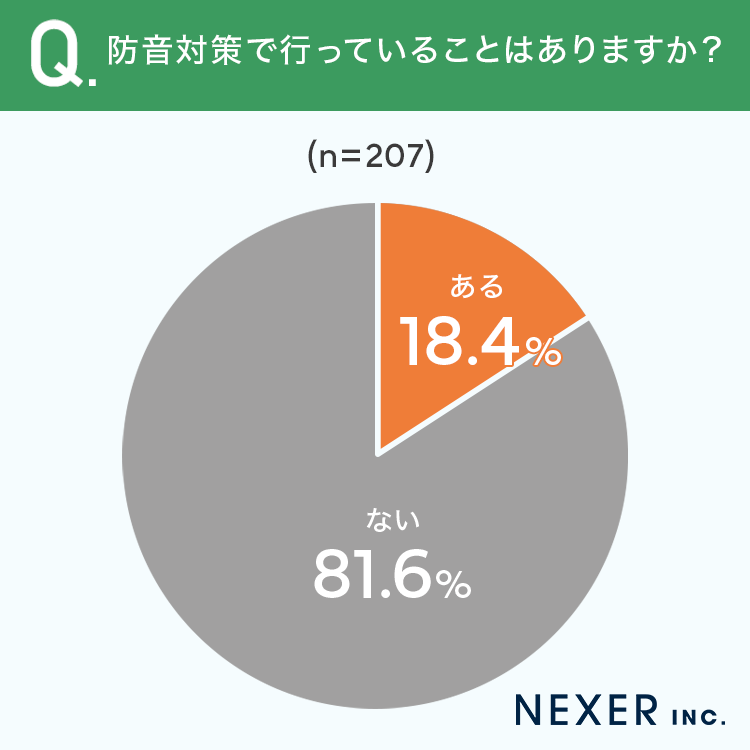 その結果「ある」と回答した方は18.4%にとどまりました。生活音を気にする方が多い一方で、実際に対策を講じている方は2割弱という結果となりました。