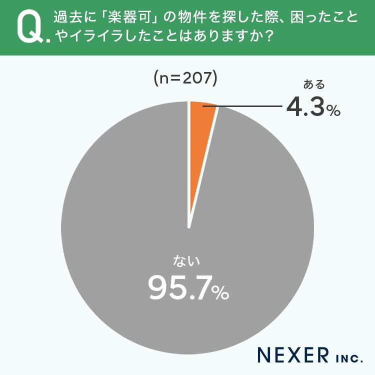 その結果「ある」と回答した方は4.3%でした。楽器可物件を探した経験がある方自体は限られていますが、実際に探した方の中には苦労した経験があることがわかります。