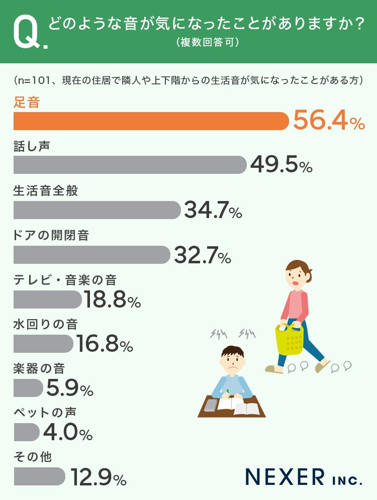 最も多かったのは「足音」で56.4%、次いで「話し声」が49.5%、そして「生活音全般」が34.7%という結果でした。「ドアの開閉音」も32.7%で、日常のちょっとした動作音が気になる方も多いようです。