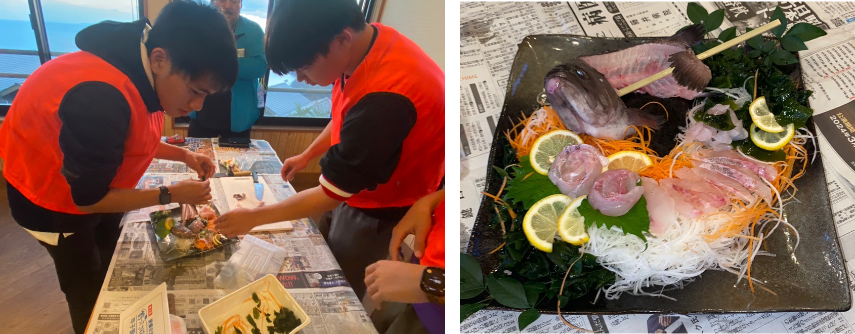 初日最後の種目は「魚のさばき方対決」です。さばく魚種は当日発表されるのですが、今回はなんと…マハタ! 地元の高級魚です。講師を務める地元の料理人も、「マハタをさばく機会はそう多くないですね」とのこと。全チーム、マハタをさばくのは今回が初めての経験でしたが、チームで協力して何とか姿作りを完成させます。腹骨がきれいにすけているか、身が多く残っているかなどのさばく技術に加え、盛り付けの美しさや独創性も採点基準となります。各チーム、制限時間の20分をギリギリまで使ってマハタの姿作りを仕上げました。