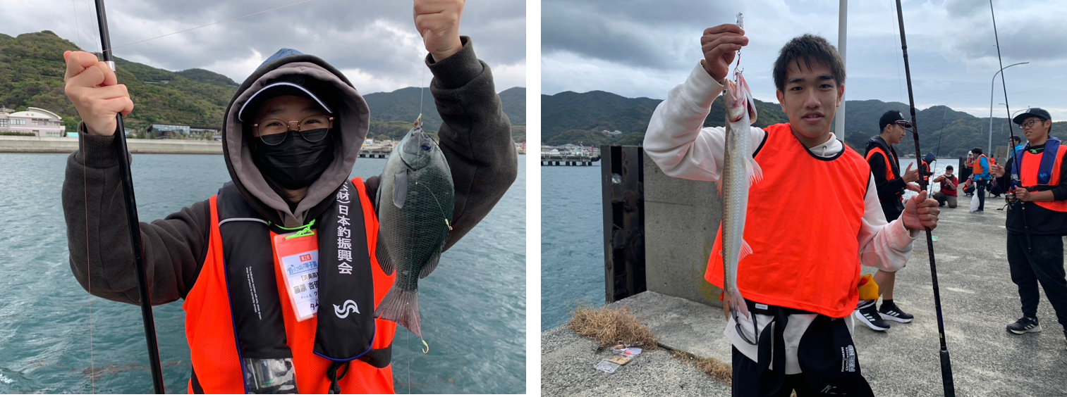 2日目に行われたのは最終種目の「釣り」。参加者は、まだ夜明け前の午前6時に会場となる三崎港に集合します。ライフジャケットの正しい着用方法や今後の風の予報など、安全に関する注意事項を受けてからいよいよ「釣り」競技のスタートです。「釣り」競技は、①長さ、②重さ、③魚種数の3部門でポイント化され、配点も1日目に行われた3種目よりも高いことから一発逆転が可能です。普段から釣りが趣味の玄人チームから、初めて釣り竿を持つビギナーまで、それぞれのスタイルで釣り糸を垂らします。当日は寒気の影響で気温が低く、風が強かったため魚の活性が低い懸念がありましたが、当日釣りのサポートを頂いた釣り具のフレンド松山本店菊池店長から「こういう日は水深の浅い港の奥の方が釣れるんです」という貴重なアドバイスが。その甲斐があり、ビギナーの高校生もマアジやカワハギ、カサゴなど様々な魚種を釣りあげていました。