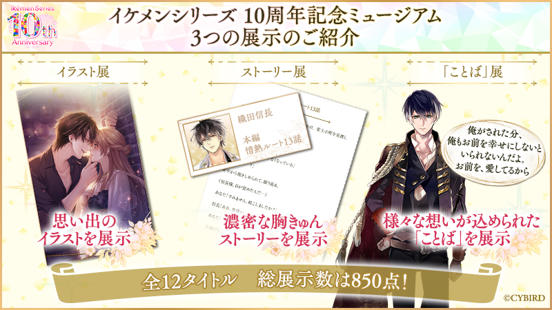 「イケメンシリーズ 10周年記念ミュージアム」では、10周年記念動画、「イケメンシリーズ」の10年間の軌跡をまとめた歴史展、そしてメインとなる3つの展示、イラスト展、ストーリー展、「ことば」展をお楽しみいただけます。メインの3つの展示には、全12タイトルが参加しており、総展示数は850点にのぼります。
