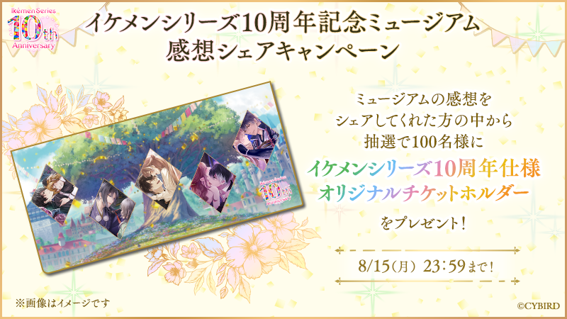 また、ミュージアムに展示されている作品を感想と共にTwitterでシェアいただいた方の中から、抽選で100名様に「イケメンシリーズ10周年仕様 オリジナルチケットホルダー」をプレゼントします。ぜひ10周年記念特設サイトからご参加ください。