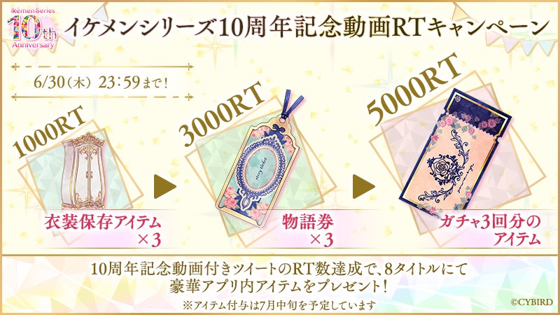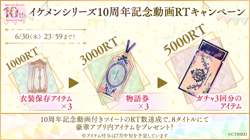 イケメンシリーズ公式Twitter(https://twitter.com/CYikemen)にて、10周年記念動画が添付されたツイートのRT数に応じて、対象の8タイトルで豪華アプリ内アイテムが獲得できるキャンペーンを実施します。ぜひご参加ください。
