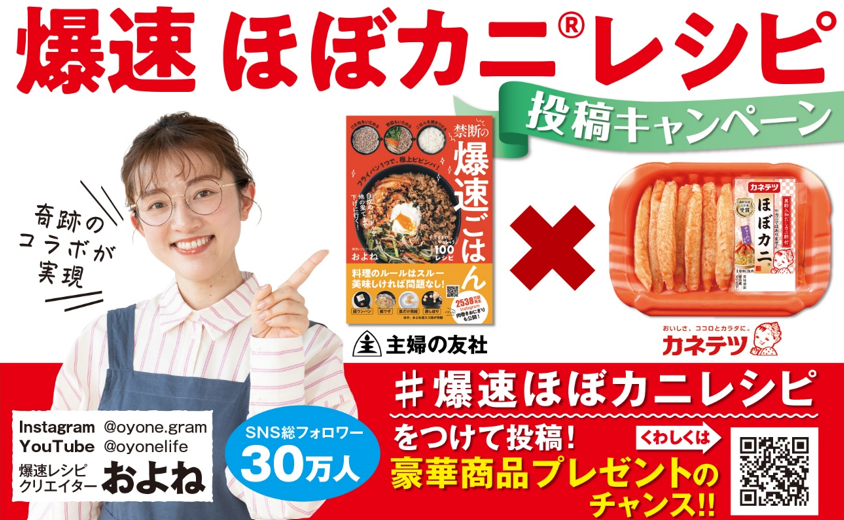 なかでもカネテツデリカフーズの人気商品『ほぼカニ®』をおよねさんが愛用したびたびレシピにも登場させていることから、このたび「#爆速ほぼカニレシピ」 SNS投稿キャンペーンをカネテツデリカフーズ、主婦の友社の2社合同で開催することが決定しました。
