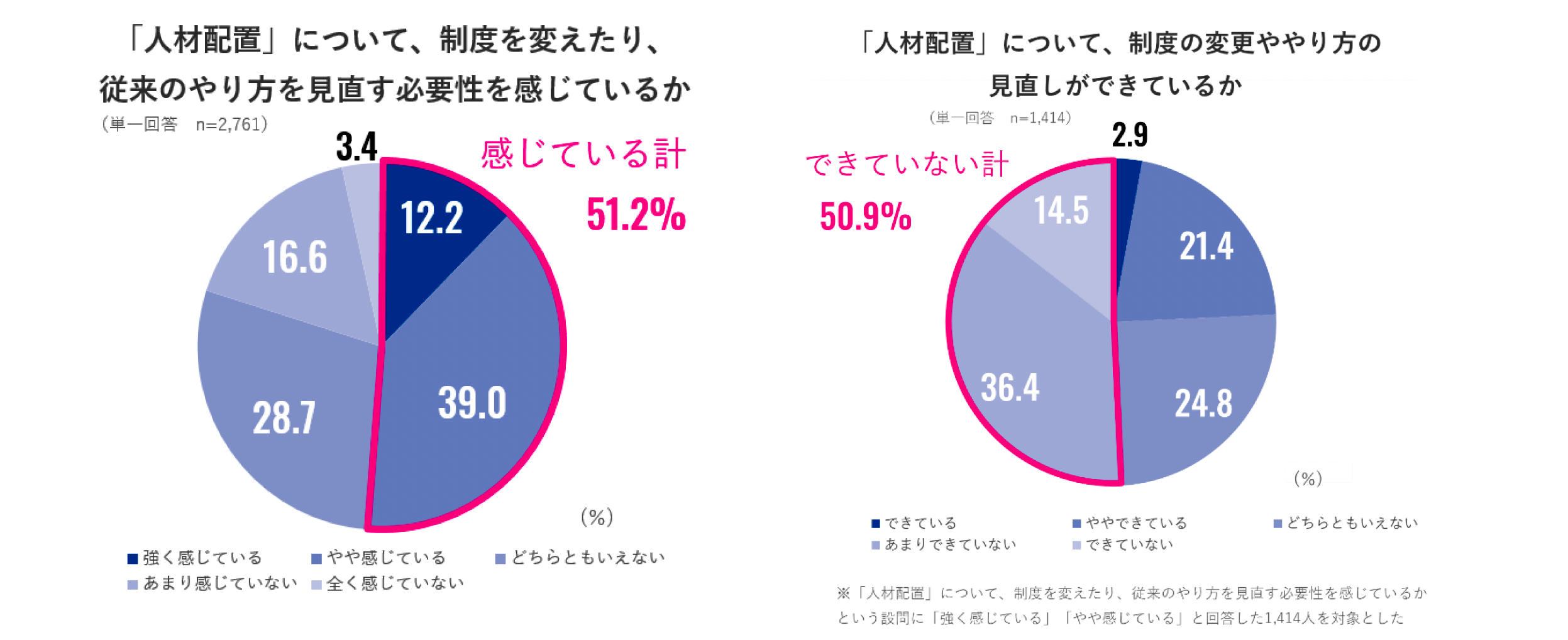 人材配置・異動の制度ややり方について、見直しの必要性を感じていながら実施に至っていない企業が多数であるという状況が浮き彫りとなっています。