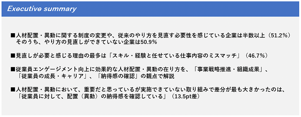 環境変化に伴うスキルの高度化・多様化や従業員の納得感醸成の観点から、従来のやり方が通用しづらくなってきており、人材配置・異動の再考を迫られている様子がうかがえます。