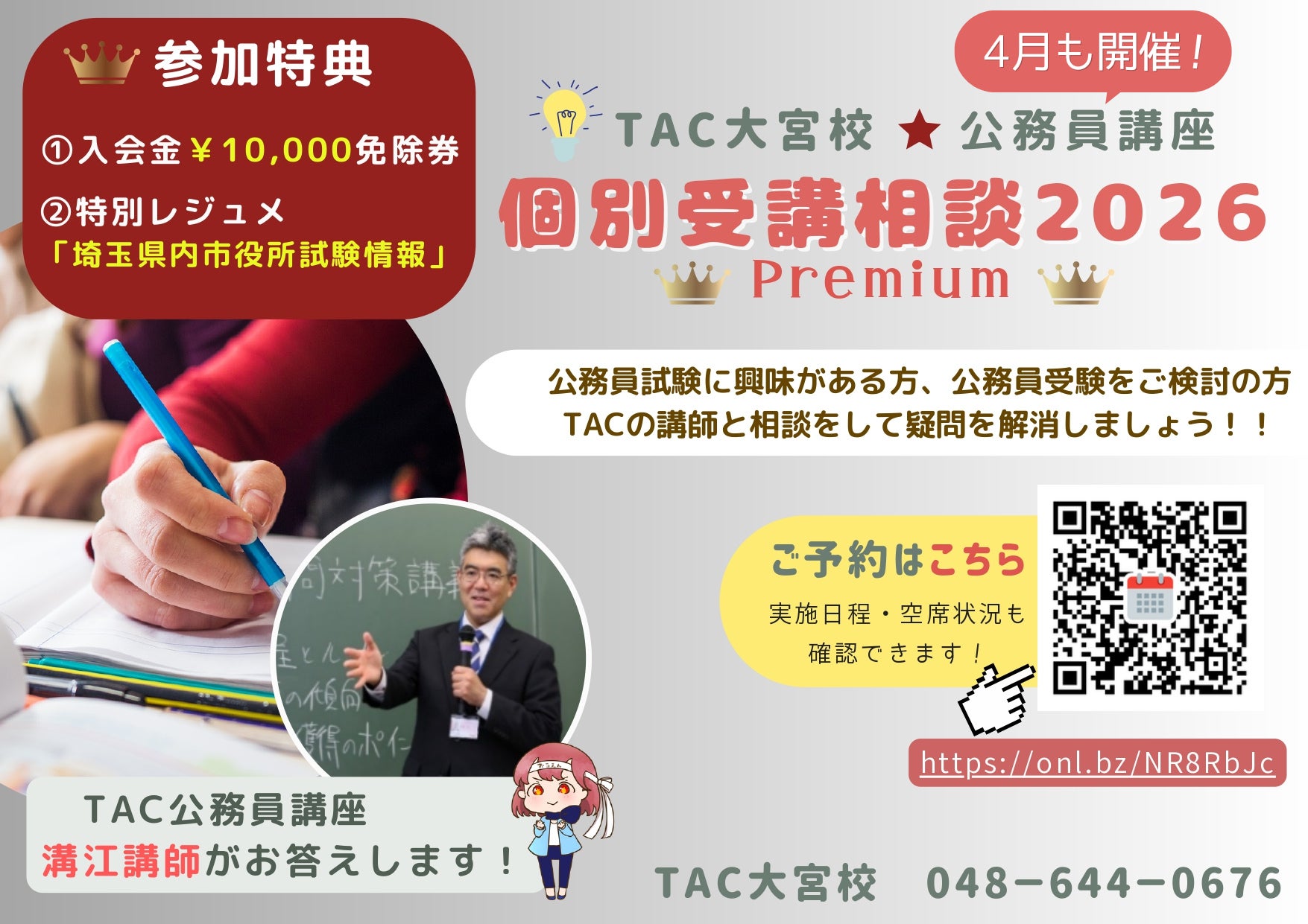 【TAC公務員】「担任講師 個別受講相談2026Premium」をTAC大宮校で4月も開催!<参加無料・要予約>
