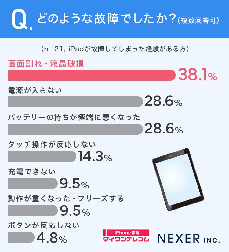 今回の調査では、iPad利用者の約16%が故障を経験しており、故障内容としては「画面割れ・液晶破損」が最も多いことがわかりました。