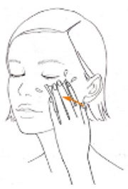 ①人差し指の側面と親指で骨をつかむようにして、 フェイスラインの骨に沿ってあご先から耳の下まですべらせます。(3 回)