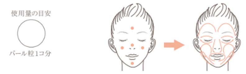 ●スパチュラを使って、パール粒1コ分を目安に指先にとり、顔の5カ所(両ほお、額、鼻、あご)においてから顔全体にていねいになじませます。