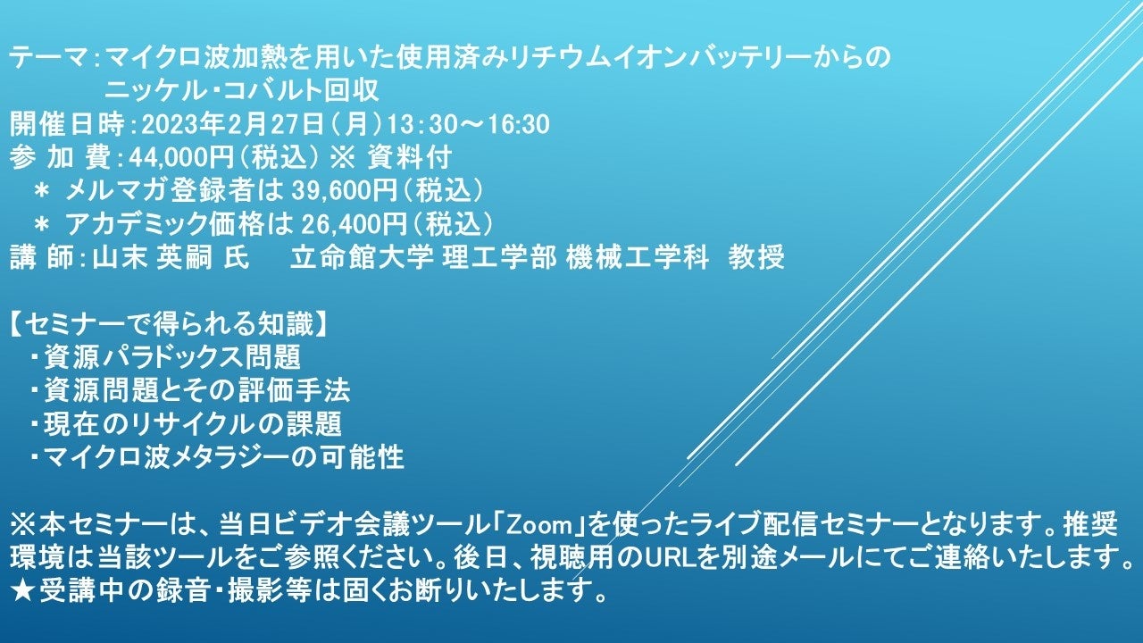 先端技術情報や市場情報を提供している(株)シーエムシー・リサーチ(千代田区神田錦町: https://cmcre.com/ )では、 各種材料・化学品などの市場動向・技術動向のセミナーや書籍発行を行っておりますが、 このたび「マイクロ波加熱を用いた使用済みリチウムイオンバッテリーからのニッケル・コバルト回収」と題するセミナーを、 講師に山末 英嗣 氏 (立命館大学 理工学部 機械工学科 教授)をお迎えし、2023年2月27日(月)13:30より、 ZOOMを利用したライブ配信で開催いたします。 受講料は、 一般:44,000円、 弊社メルマガ会員:39,600円、 アカデミック価格は26,400円となっております(資料付)。