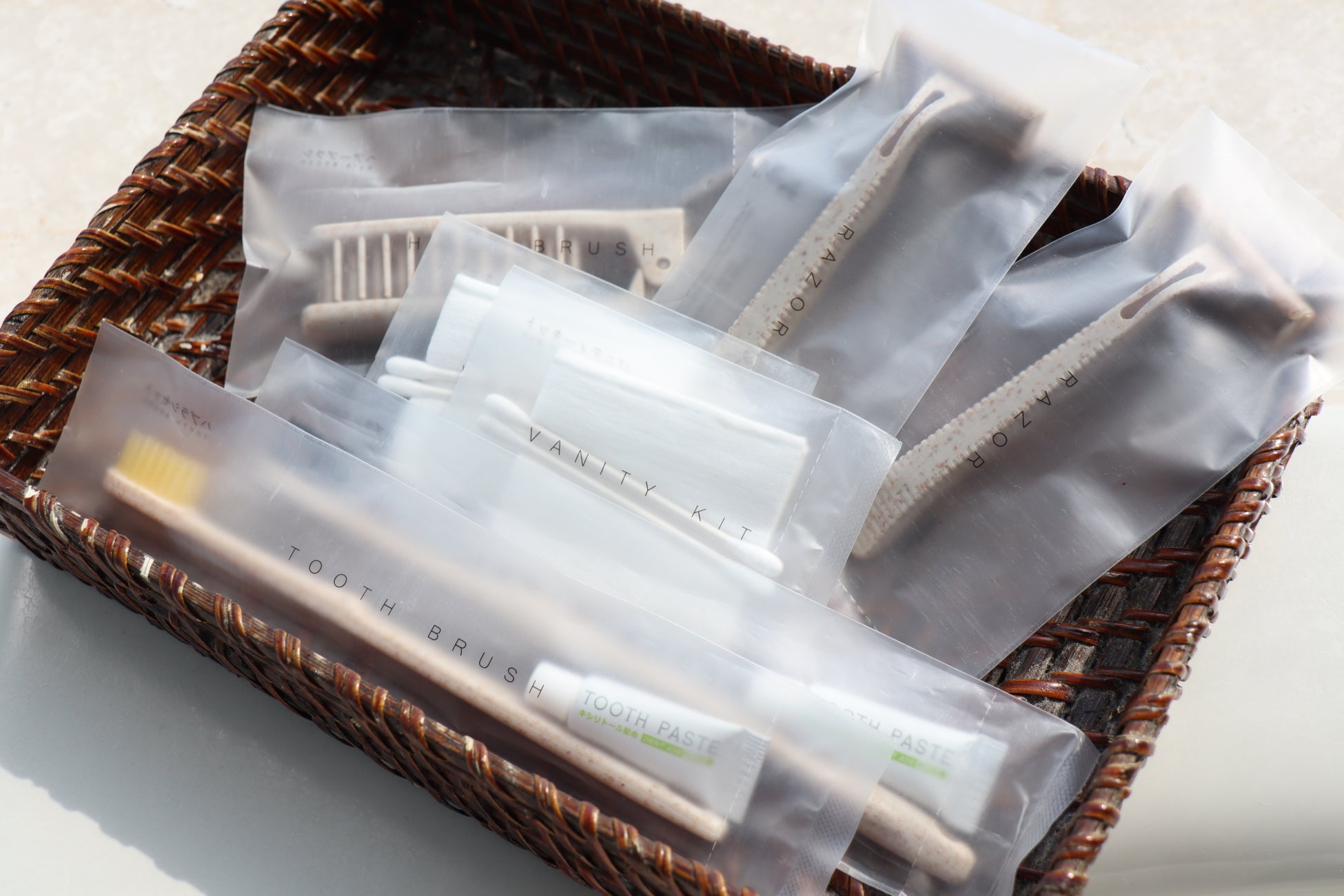 アメニティには、「eCO amenity series」を採用。これまでの一般的なポリプロピレン樹脂(PP)に籾穀(もみがら)を配合した原料を使用することで、プラスチック使用量を約40%削減した環境負荷低減型アメニティです。また、「eCO amenity series」のなかでも、残りのプラスチック部分にPCR(再生プラスチック)を配合し、「プラスチック使用削減」と「資源循環」の両方の観点から環境負荷を低減させる「THE eCOH」を、ハブラシセット・ヘアブラシ・レザーに採用いたしました。