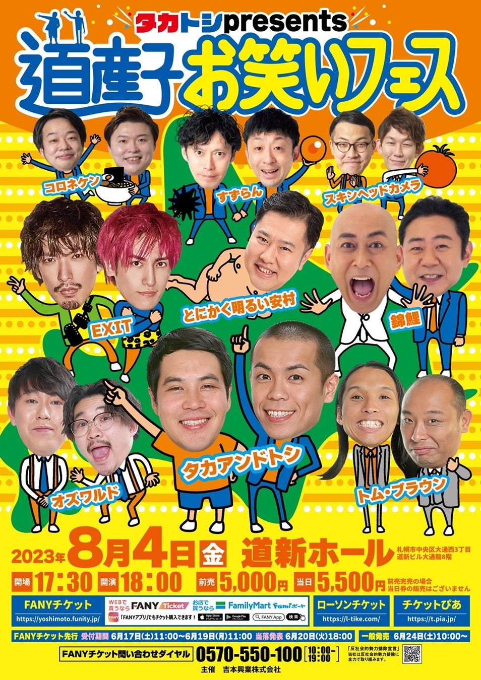 この度、吉本興業所属・タカアンドトシが地元北海道・札幌にて、道産子芸人を集めた企画ライブを開催することが決定致しました。タカアンドトシの他に、アーティストやアパレルプロデュースなど芸人の枠にとどまらず幅広く活躍中のEXITや、イギリスの大人気オーディション番組(Britain’s Got Talent)の決勝に進出しグローバルに話題沸騰中のとにかく明るい安村や、2年連続M-1グランプリ決勝戦に出場したオズワルド、2021年M-1王者の錦鯉(ソニー・ミュージックアーティスツ)など多くの道産子芸人達が、ネタ披露のみならず、北海道愛を感じられるコーナー企画など盛りだくさんの内容でお届けします。是非会場にてお楽しみ下さい。