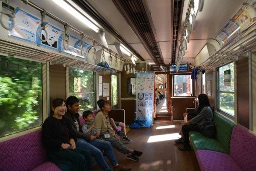 展示の初日は明知鉄道株式会社のご協力で貸切列車を運行いただき、体験学習イベントに参加した児童やその家族を招待してポスター展示車両の乗車会を開催しました。貸切列車は2023年10月21日(土)の午前11時20分恵那駅発の明智行き。6家族22人が参加し、子どもたちが描いたポスターを眺めながら終点の明智駅まで約50分間の列車の旅を楽しみました。家族5人で参加した芥見小学校5年の児童は「魚が暮らしやすい環境をイメージして描いた。ごみのポイ捨てをしないようにしようと思ってもらえるといい」。その保護者は「乗車を楽しみながら娘と話し、海の課題について考えることができた」と喜んでいる様子でした。作品に「海を大切に」とメッセージを書いた真桑小学校6年の児童は「自分の絵が飾ってあってうれしかった。ごみを捨てないようにしようと呼び掛けたい」。その保護者は「夏休みのイベントで学んだことが伝わってきた。これからも家族で海の環境のことを考えていきたい」と話していました。