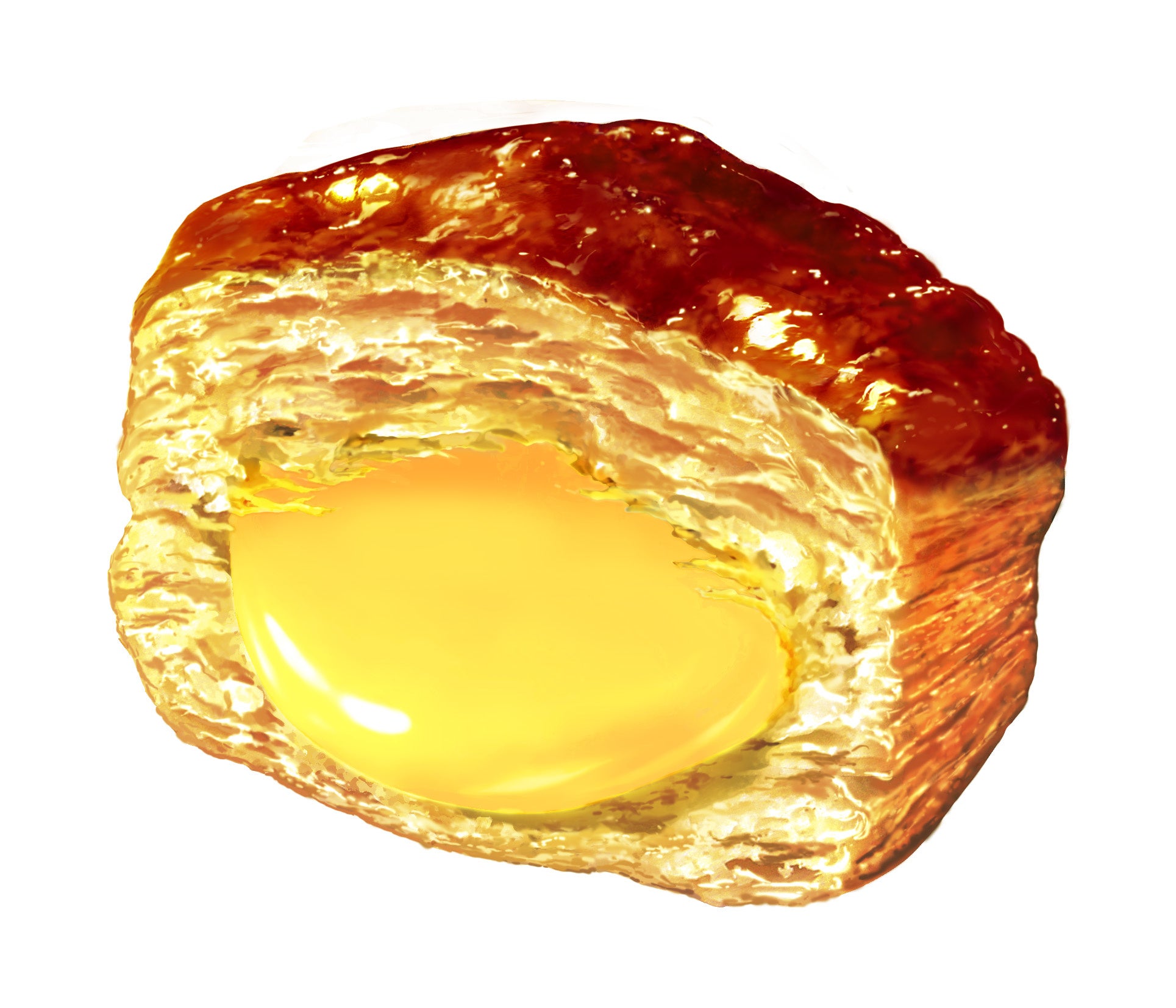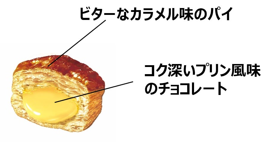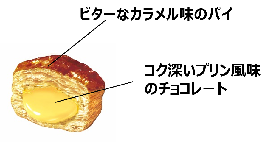 ビター感のあるカラメル味のパイ生地に、コク深い卵の味わいが堪能できるチョコを組み合わせた、昭和レトロなちょっと固い食感のプリンの味わいをパイの実で表現しました。
