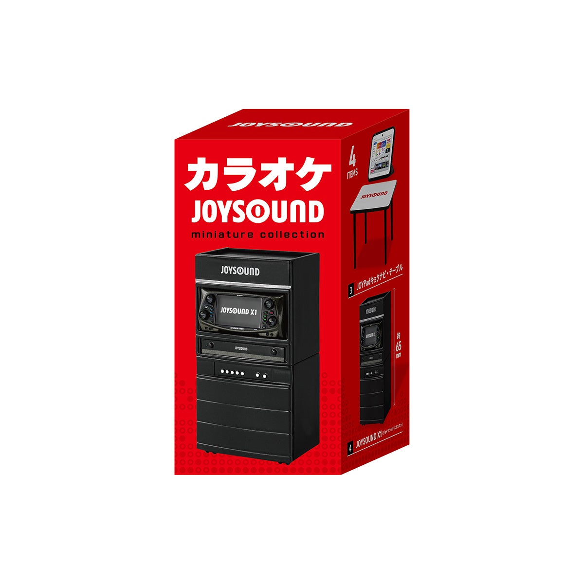 カラオケボックスの情景をリアルに再現できるミニチュアフィギュアのラインナップは、「JOYSOUND X1」「モニター・マイク・充電器」「ペンライト・椅子・ドリンク」「JOYPadキョクナビ・テーブル」の全4種で、カプセルトイは1 個 500 円(税込)、ブラインド BOXは1 個 550 円(税込)で販売。