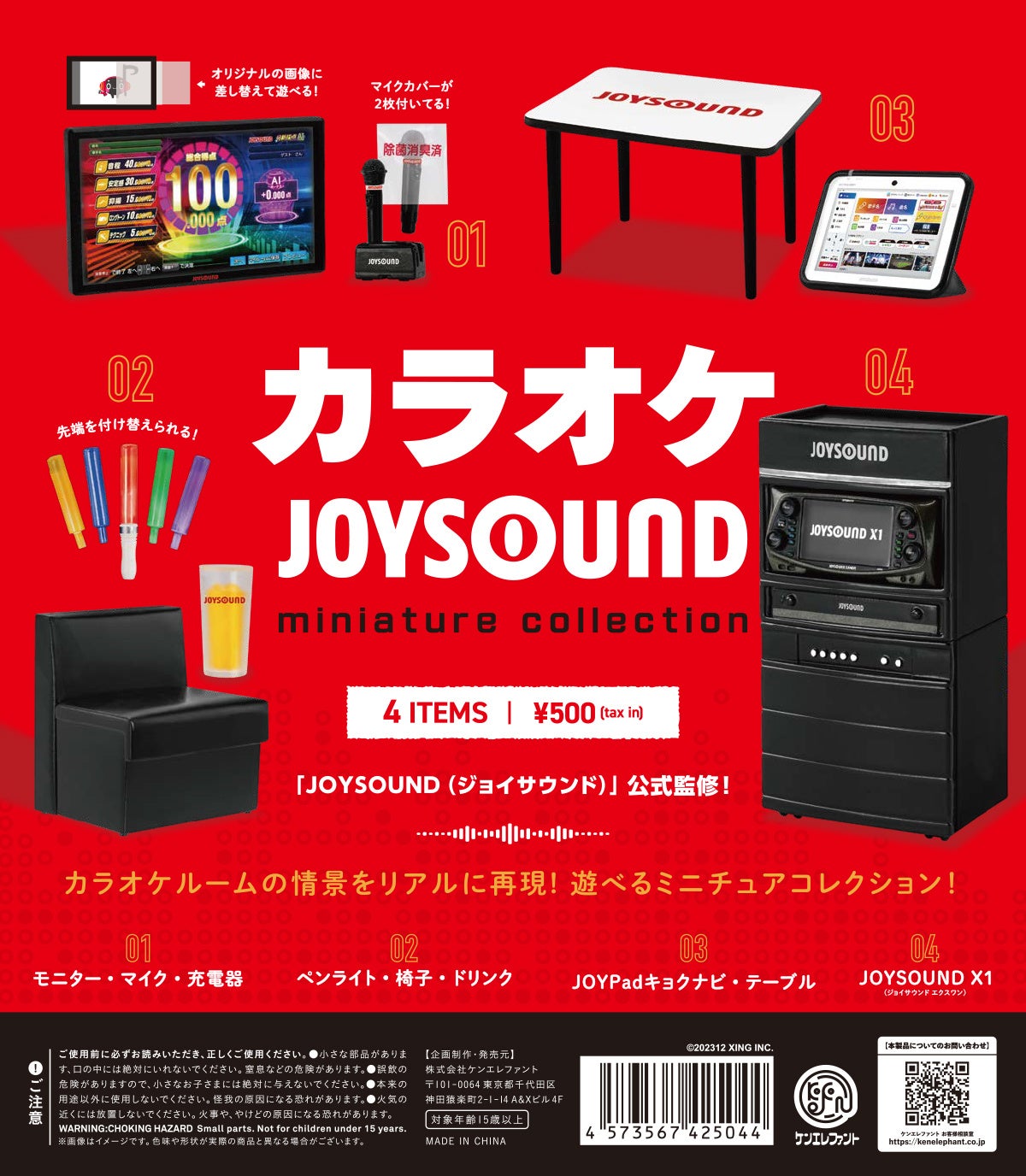 株式会社エクシング(本社:名古屋市瑞穂区、代表取締役社長:水谷 靖)が11月発売した最新機種「JOYSOUND X1(ジョイサウンド エクスワン)」をはじめ、モニター・マイク・充電器、ペンライト・椅子・ドリンク、JOYPadキョクナビ・テーブルといったカラオケに欠かせないアイテムをミニチュア化した「カラオケ JOYSOUND miniature collection」(全4種)が、株式会社ケンエレファントより12月下旬に発売され、全国のカプセルトイ売り場などに展開されます。また、ケンエレファントのオンラインショップ・ケンエレストアでは、予約を開始しております。