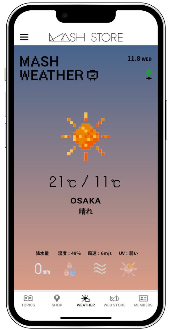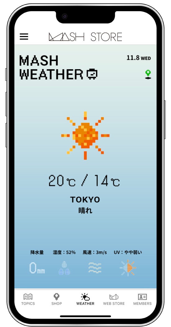 現在地の天気はもちろん、エリアを設定することで市区町村まで指定した天気予報の表示も可能。天気マークのアイコンが動いたり、時間帯と背景の色が連動するなど、MASH STOREならではの遊び心あるデザインに。