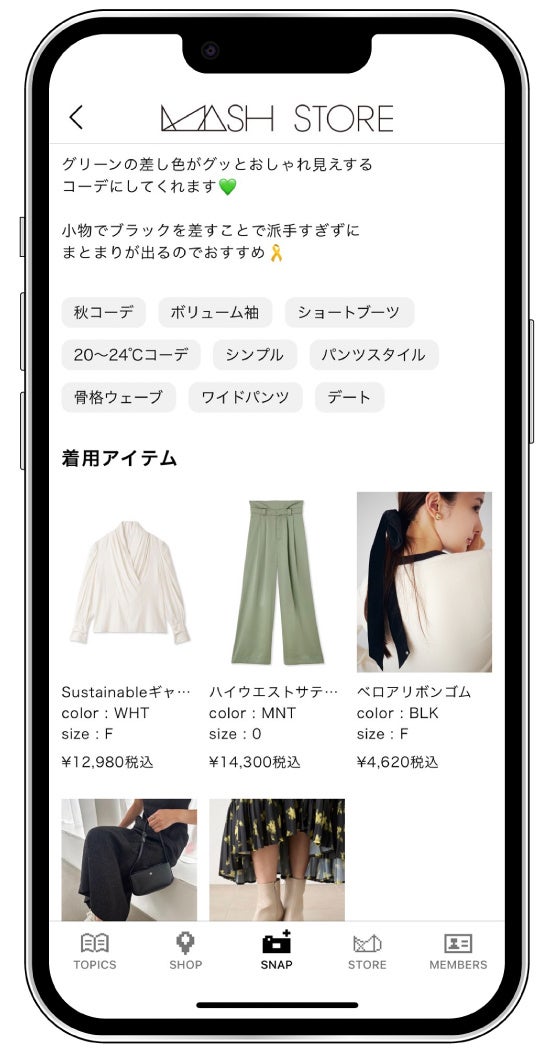 表示されるコーディネートは、マッシュグループの展開するレディスブランドの最新トレンドを取り入れ、フェミニンからモードまで多種多彩なスタッフスナップの中から常時5コーディネート以上が表示されます。また、新たなコーディネートが投稿されると天候に応じて即時反映されるようになっているため、まるで店頭で接客を受けているかのように、鮮度の高いコーディネートのヒントを常時受け取ることが可能です。さらに、表示されたコーディネートの写真をタップすると、着用アイテムをそのまま購入することもでき、シーズンに合わせた心地よいショッピング体験をお届けします。