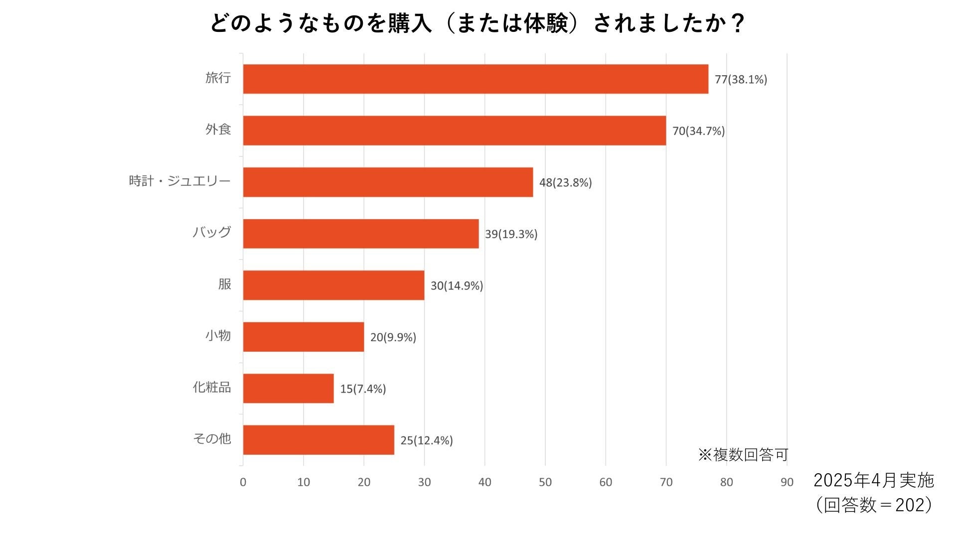 購入(または体験)したものは、旅行(77名)が最も多く、次いで外食(70名)、時計・ジュエリー(48名)と続きました。旅行の行き先としては、ハワイ、沖縄、北海道、ディズニー関連など。時計、ジュエリー、バッグは一生ものと呼ぶにふさわしいラグジュアリーブランドの逸品が数多く挙げられていました。