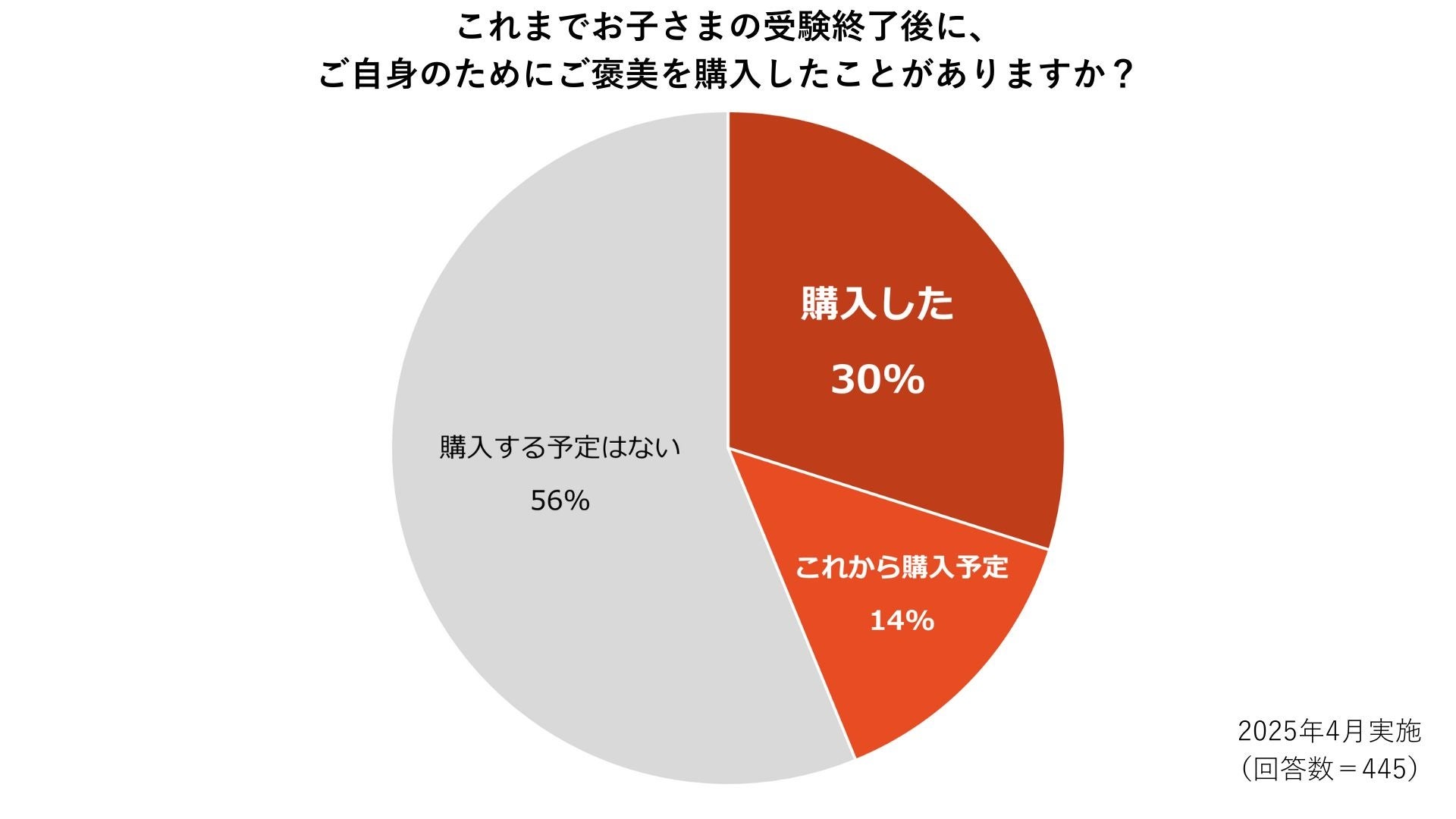 読者アンケート(25年4月実施。n=445)からは、約4割の母親が、受験に家族で挑み乗り切った後、自分へのご褒美買いを予定していることがわかりました。