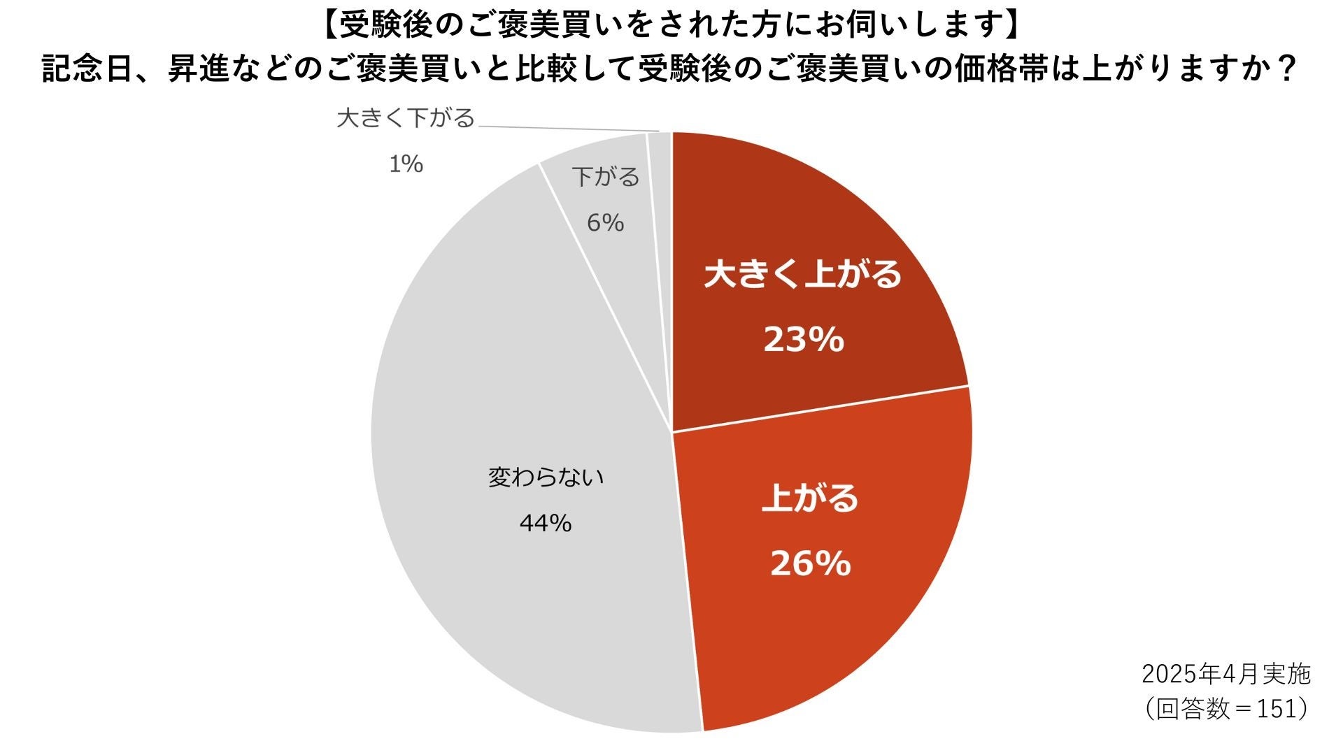 受験後の解放感からか、約5割の方が記念日や昇進などのご褒美買いと比較して、「価格帯が大きく上がる」または「上がる」と回答しました。