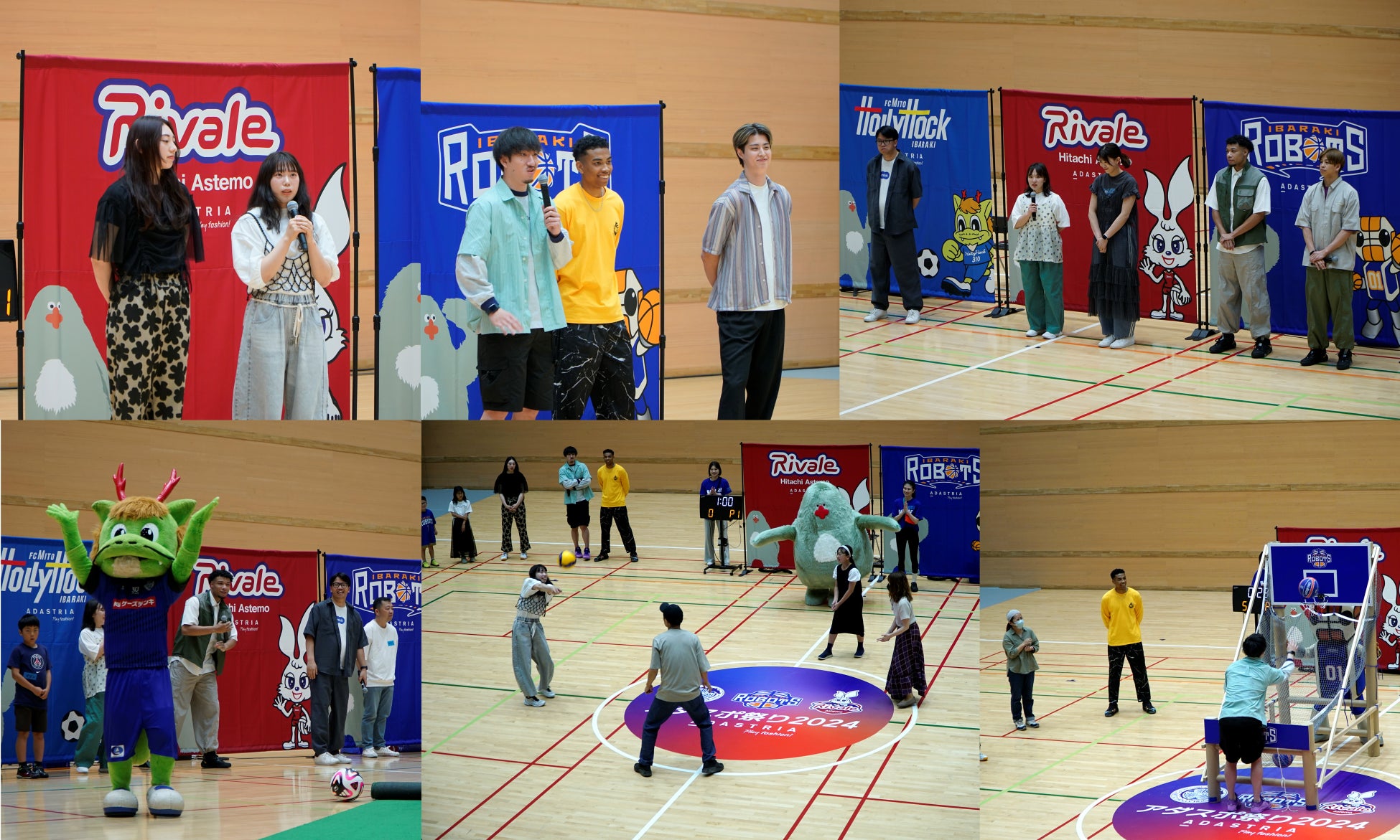 当社がスポンサーを務める「茨城ロボッツ」「水戸ホーリーホック」「日立Astemoリヴァーレ」の3つのチームとファンが、競技の垣根を越えて集まりました。選手のみなさまはアダストリアがコーディネートした私服ファッションで登場し、抽選で選ばれたファンの方々とのミニゲームに挑戦しました。