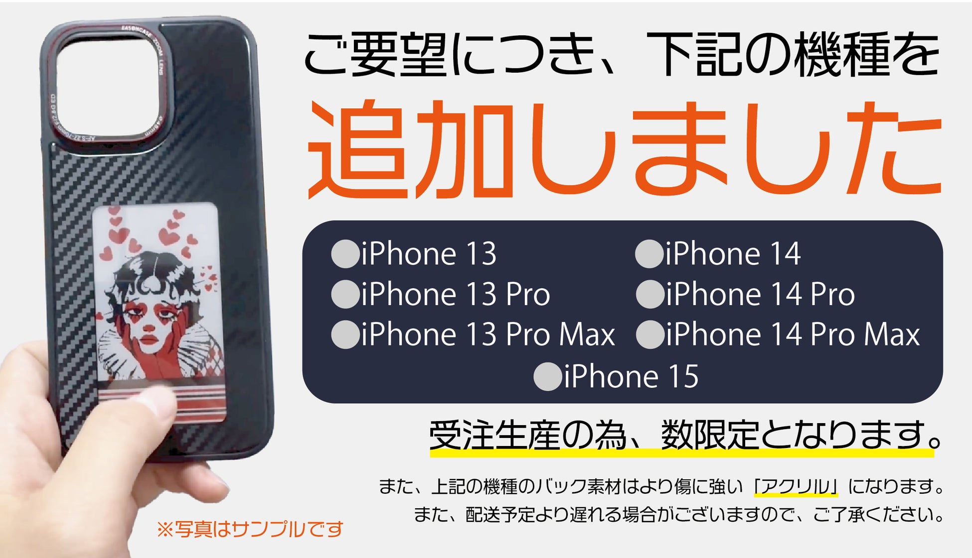 iPhone13・14シリーズ・iPhone 15:TPU+PC+アクリル iPhone 15Pro・iPhone 15 Pro Max:TPU+PC+防爆ガラス |