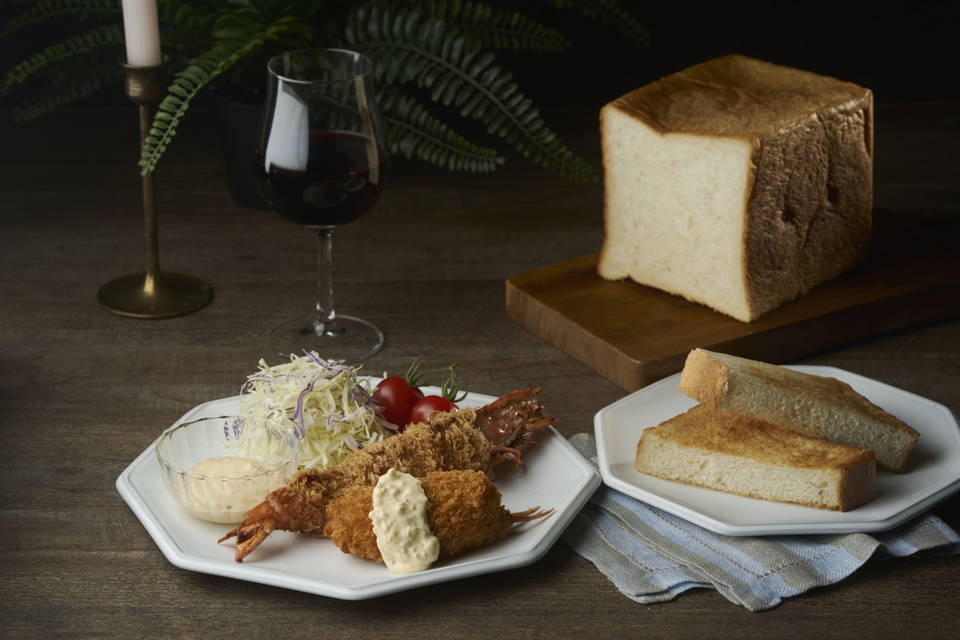湯種を使用してじっくり焼き上げたもっちり感覚、朝パンの代名詞でもある食パンを一気に「夜パン」に変身!かりっとトーストしたらデパ地下ならではのリッチなフライとあわせて技あり!タルタルソースを添えても。