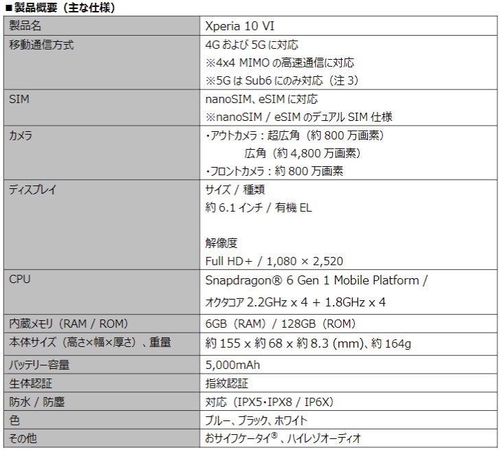 そのほか、約164gの軽量ボディと幅約68㎜のハンドフィット感抜群のスリムさを兼ね備えた軽やかなデザインに加え、防水(IPX5・IPX8)・防塵(IP6X)(注10)、指紋による生体認証、おサイフケータイ®、nanoSIMとeSIMのデュアルSIMにも対応など、日常生活の様々なシーンにて、快適に安心してご利用いただけます。