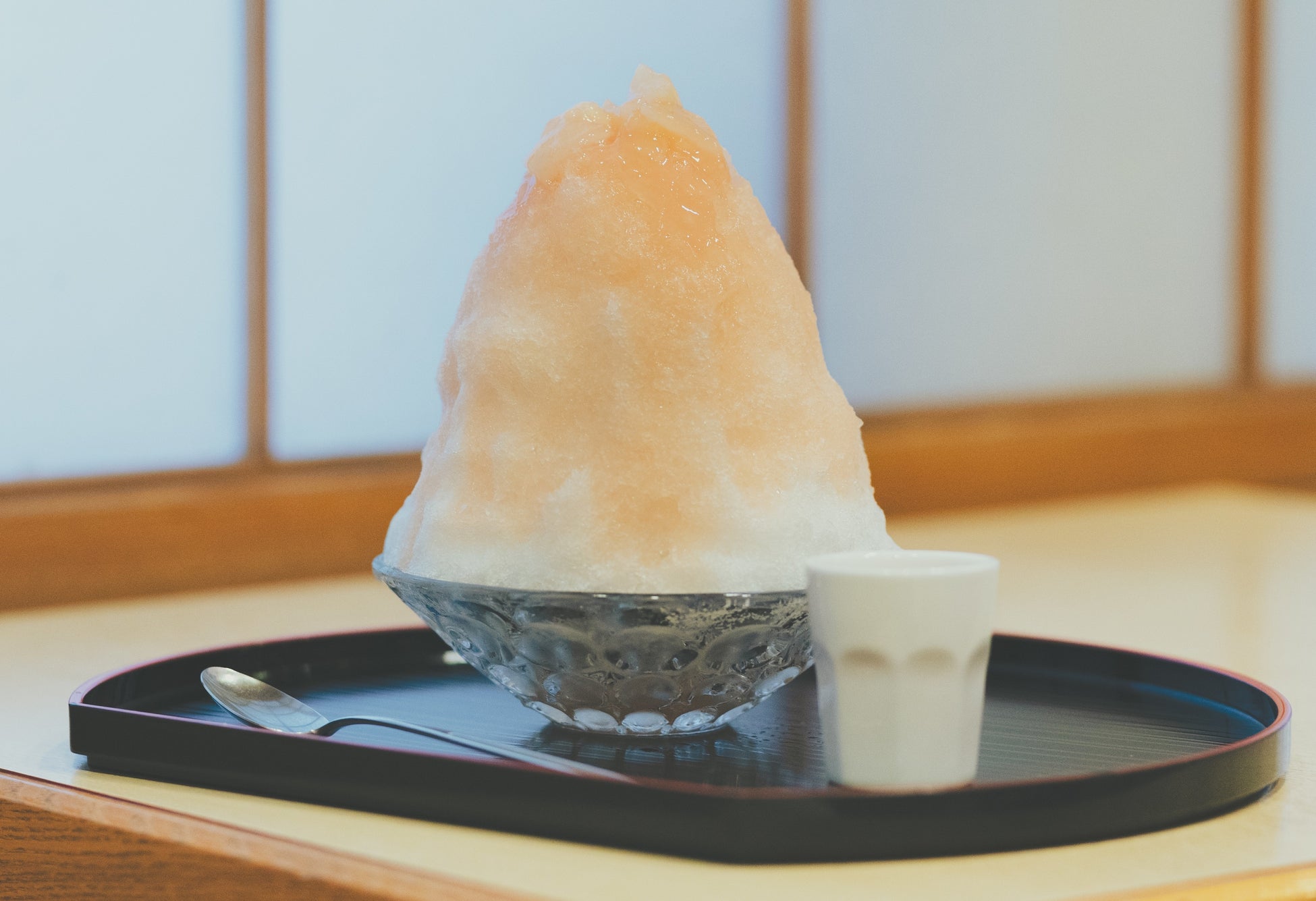 パウダースノーのようにきめの細かい氷と桃の果肉とシロップをかけたシンプルなかき氷。こだわりの氷はマイナス20度で締めたあと、発泡スチロールのケースに入れ常温で約3時間戻したものを、かき氷機の刃を限界まで薄い設定にして削っているのでここまでフワフワに。