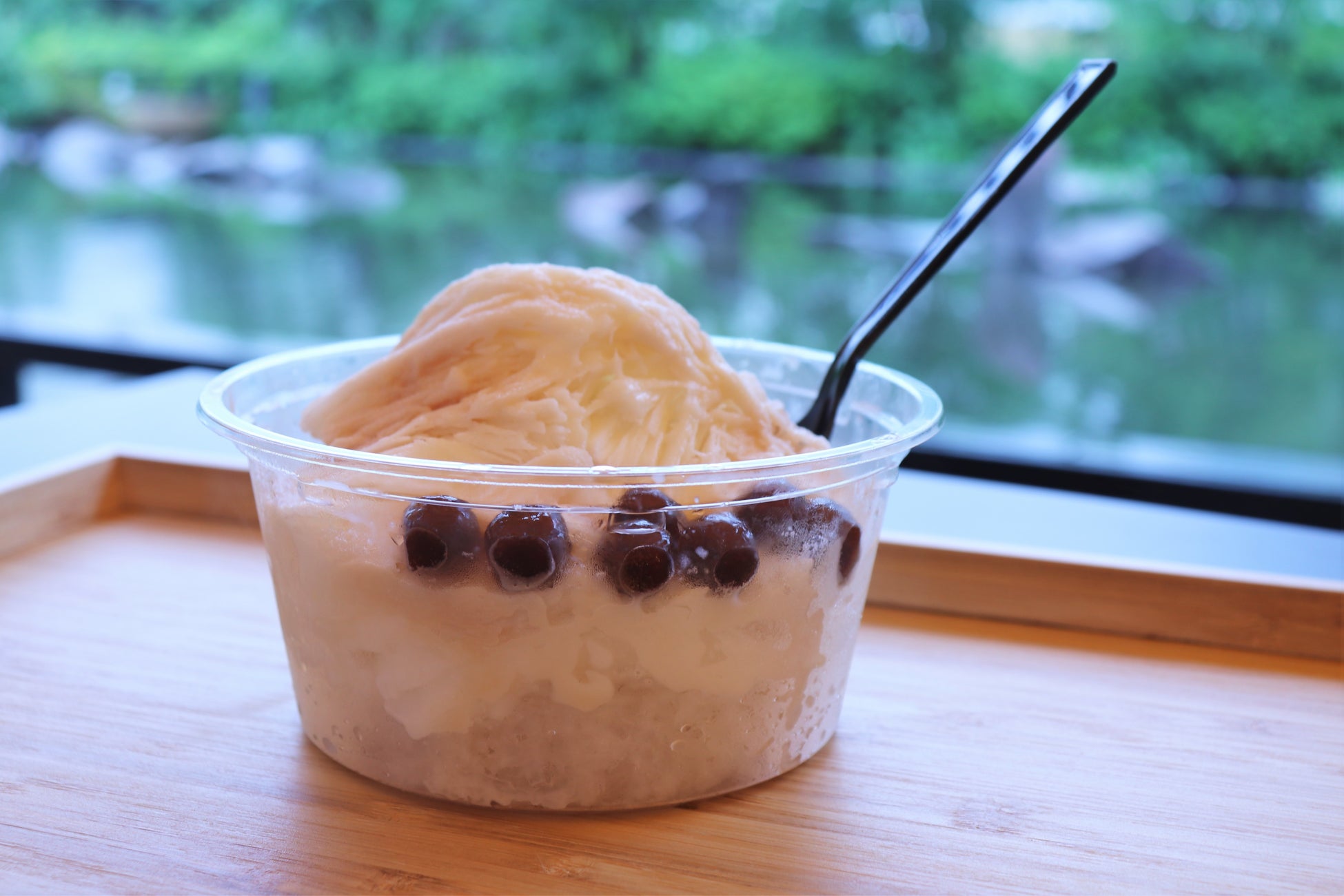職人がひとつひとつ手包みする焼小籠包で人気の台湾小皿料理店からは台湾かき氷が登場。マンゴーとミルク、味付けされた氷を削ってつくる「台湾風かき氷」。 濃厚なマンゴー味の氷の上には、果肉もたっぷり。優しい甘さのミルク味の氷には紅茶風味の シロップ。もちもちのタピオカが食感のアクセントに。
