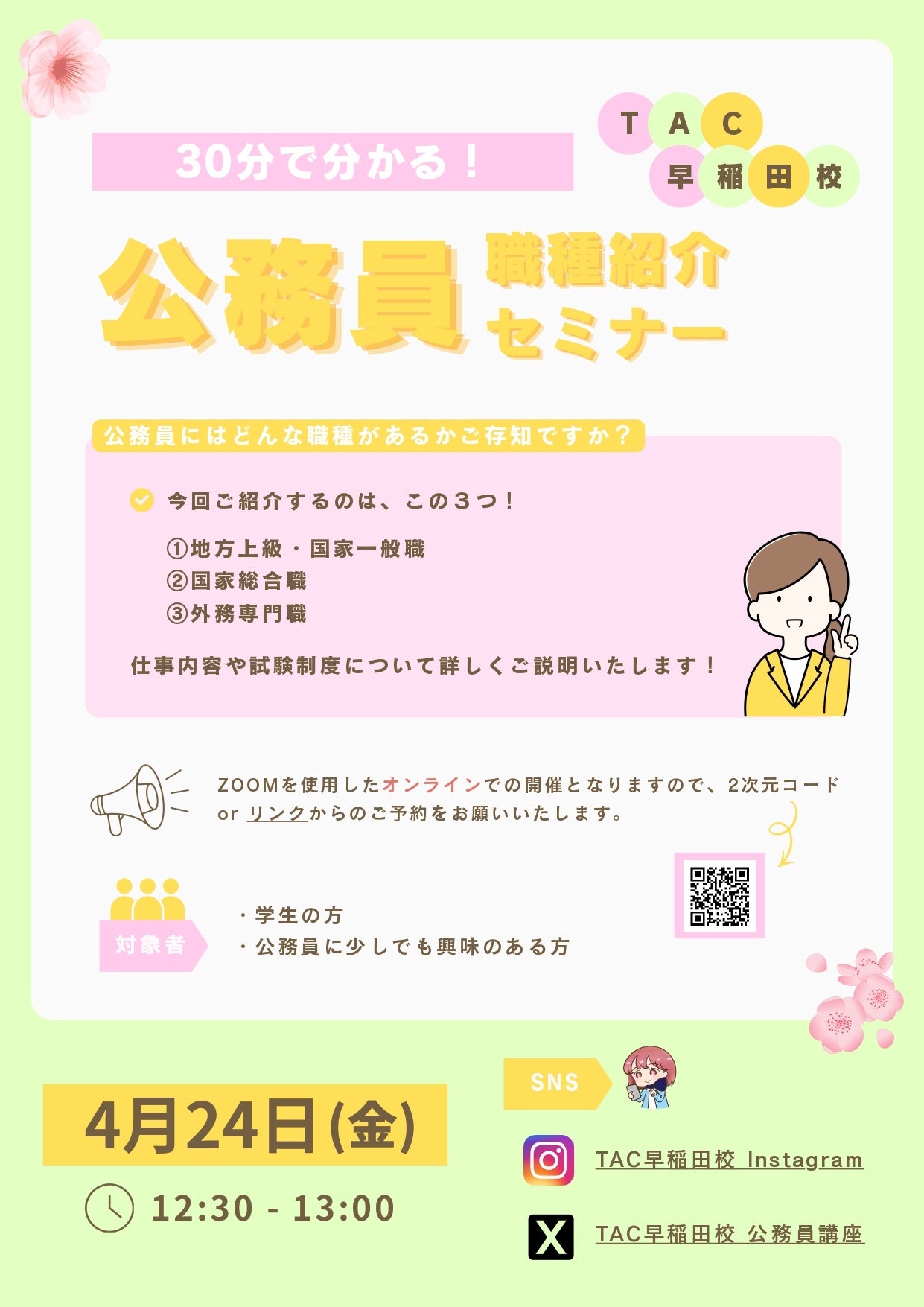 TAC早稲田校では、①地方上級・国家一般職、②国家総合職、③外務専門職の3つの講座を開講しております。今回のセミナーではそれら3つの講座について、試験制度や仕事内容をご説明します。セミナーに参加するにあたり、ご不明な点などございましたらお気軽にお問合せ下さい!